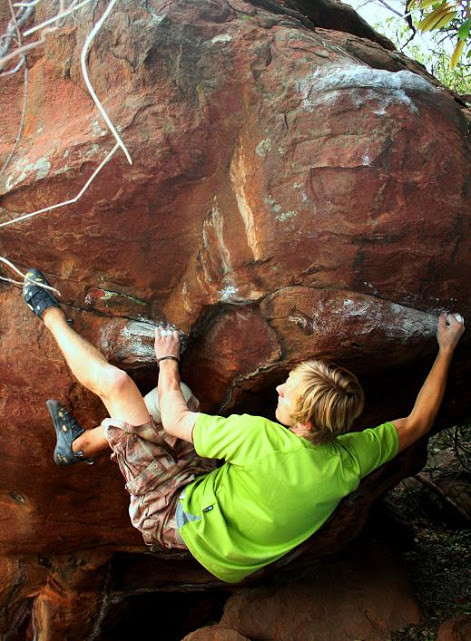 Marijus Šmigelskis on the first ascent of "Free Boat Ride For Three"