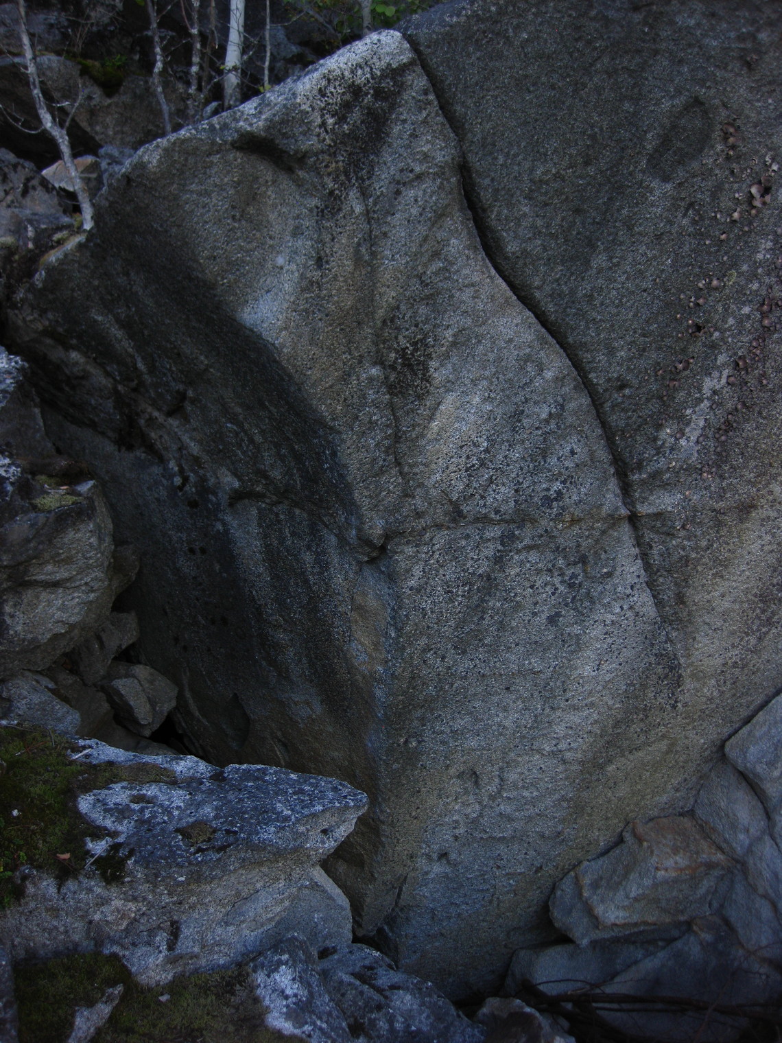 below track boulders at water level; ss on protruding block, up crack using arete; V6