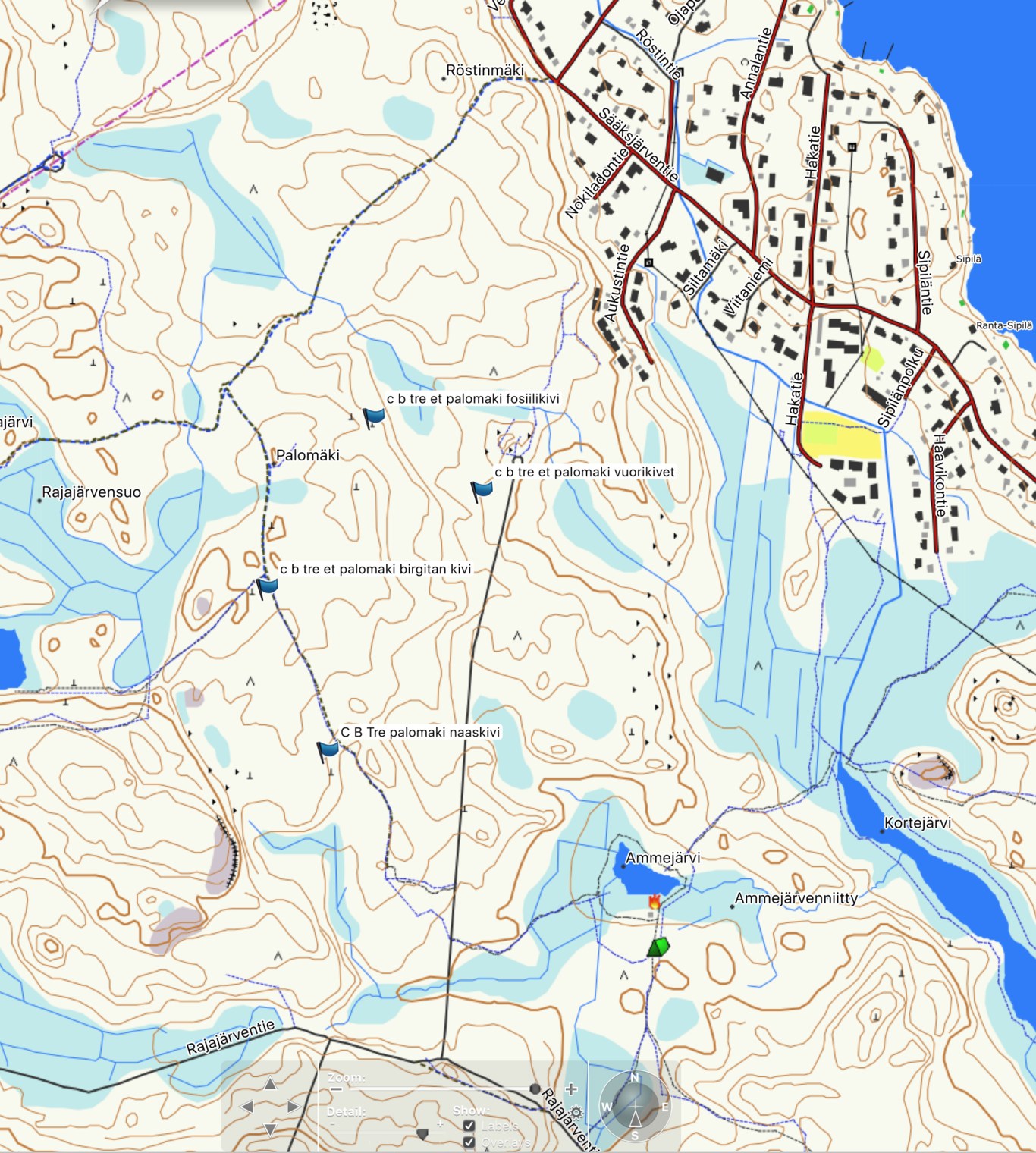 Birgitan Kivi, Nääskivi and Vuorikivet are close to path, others (Fossiilikivi) more or less in the woods.