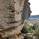Steep climb with a beautiful kneebar-beta for people with short arms (people with long arms can skip some moves) and a very nice mantle. Works fine with a sitstart on the left (good incut sidepull-crimp and diagonal slopey pinch) ...