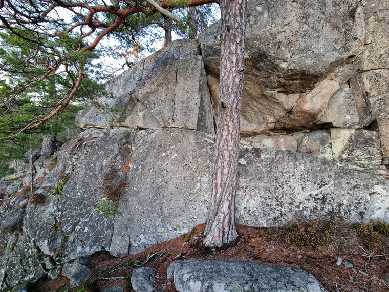 Spricka vid kanten till vänster om tallen. Graderad som ledklättring.