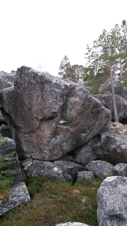 Sitt start på stenen till höger följ areten till toppen på en kak bit och mantla. Kan börjas med en häl på kanten.