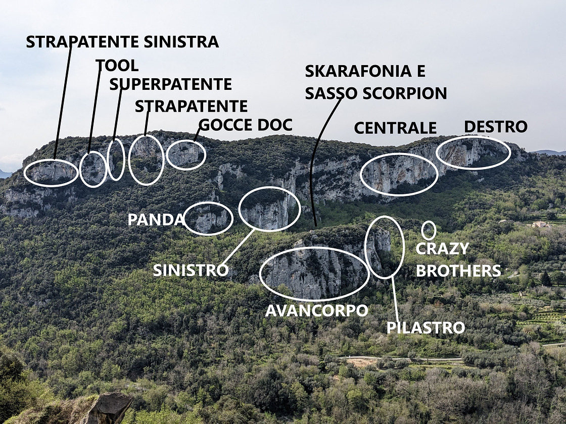 • Morning: Bastionata Centrale, Bastionata Destra, Bastionata Sinistra, Avancorpo, Il Pilastro, Grotta Strapatente, Settore Sinistro, Tool, Gocce Doc, Panda