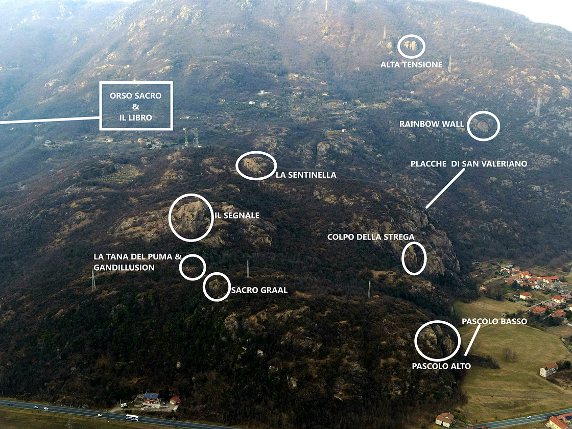 ●"La Sentinella":Despite its modest size, this crag remains an interesting destination for climbers, thanks to its good equipment and accessible technical difficulties. The approach is convenient, making it suitable for a wide range of climbers. The rock, a typical granitic gneiss from the Borgone area, is clean and compact, offering a variety of routes ranging from moderate slabs to almost vertical walls, interspersed with roofs and occasional cracks or corners. Its south-facing exposure and modest altitude of around 550 meters make it perfect for sunny winter days and the shoulder seasons. Route lengths vary from 10 to 20 meters. However, climbing is not recommended in strong winds, as the crag is quite exposed above the valley.