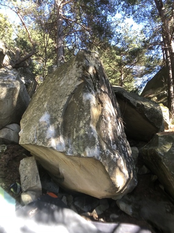 Sit Start with left hand on good hold in overhang and the right hand on the right corner of the boulder