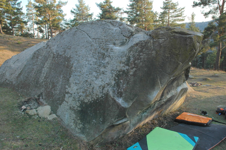 Hard project, estimated grade 8A. Start with left on a undercling sloper and with the right hand in a crimpy lateral hold. Heelhook on the left edge. Hard compression problem with dynamic move to crimpy hold then exit through "la corturi"