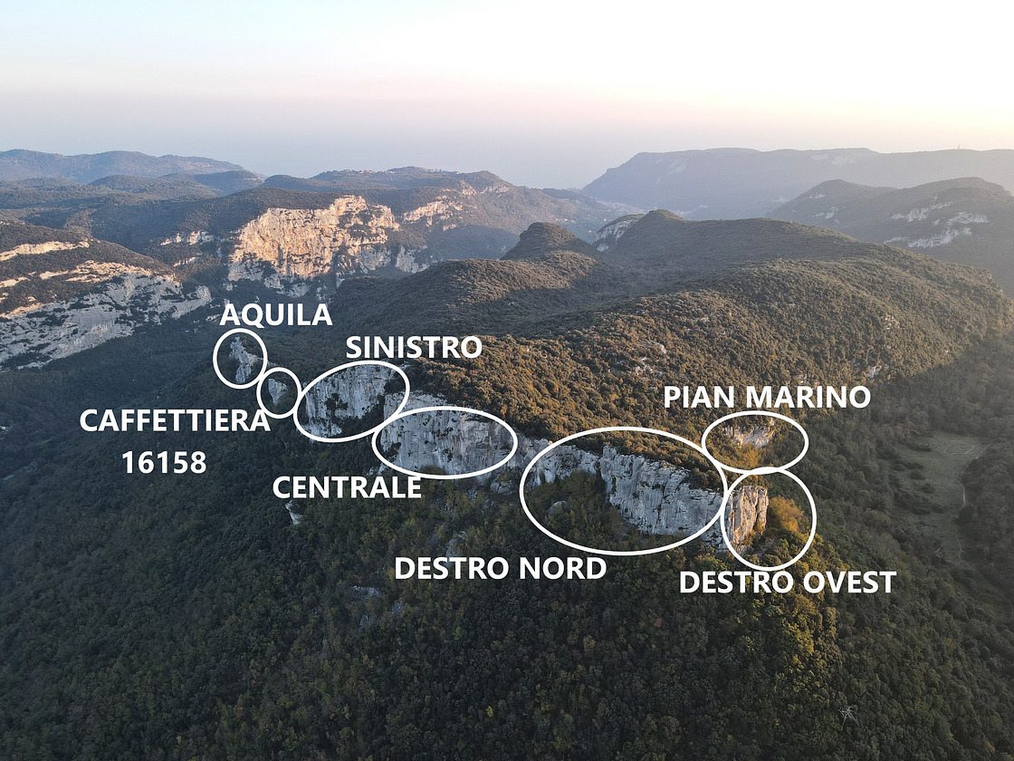 The Settore Sinistro stands out for its intertwining routes, some of which develop over two pitches. Thanks to its eastern exposure, this sector is ideal for summer climbing, offering a serene environment and varied lines. The Settore Centrale, on the other hand, hosts several classic multi-pitch routes, perfect for those seeking climbs during summer or mid-season, while preserving the charm of traditional continuous lines.