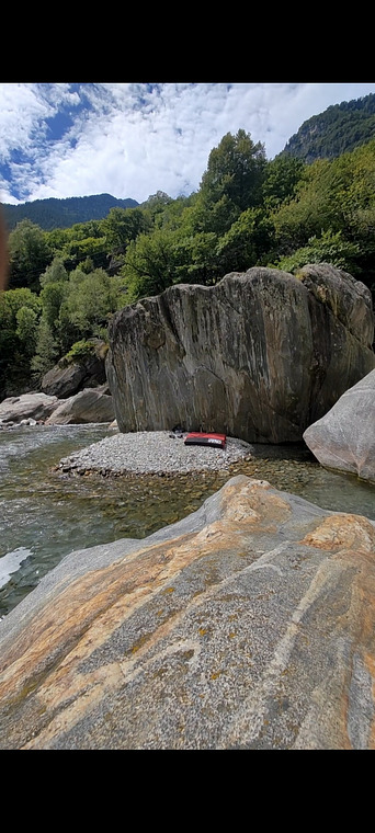 follow the obvious ridge up and left. Down climb the same way or punt off the right hand side onto the smooth white boulder in the river, then jump back onto the island