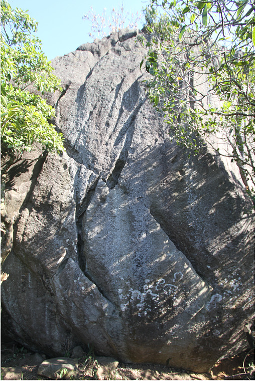 More of a solo route climb than a boulder problem. Follow the disconnected line of elongate pockets and flakes up the worryingly tall left side of the face.