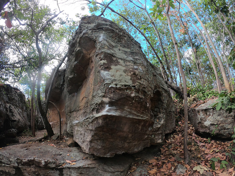 Located at end of long face of Bloc where a blunt arete changes angle. Sit start, at right end of bloc, left side of arete. Left hand on horizontal edge and right on the blunt arete. Go straight up, staying on the left of the blunt arete. Do not go around to the right as this is a variation called Ognob Ognom V1+