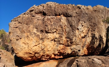 Park at the pullout indicated below. Walk along the road for about 100m and then follow the cairned path leading up to the right of the prominent Flagship Boulders. The path is about 250meters uphill.