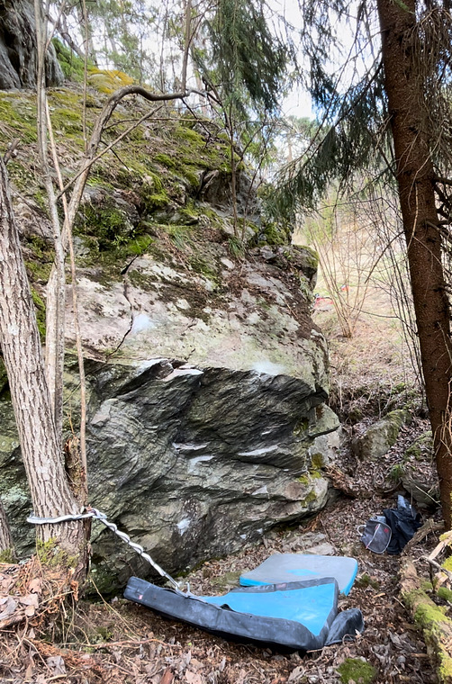 Sitstart low down, see beta vid. Finish standing on the slab. Use tree to climb down.