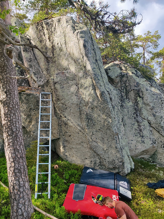 Ståstart. HH arete, VH undercling. Teknisk via krimpar. Toppar ur på hylla till vänster.