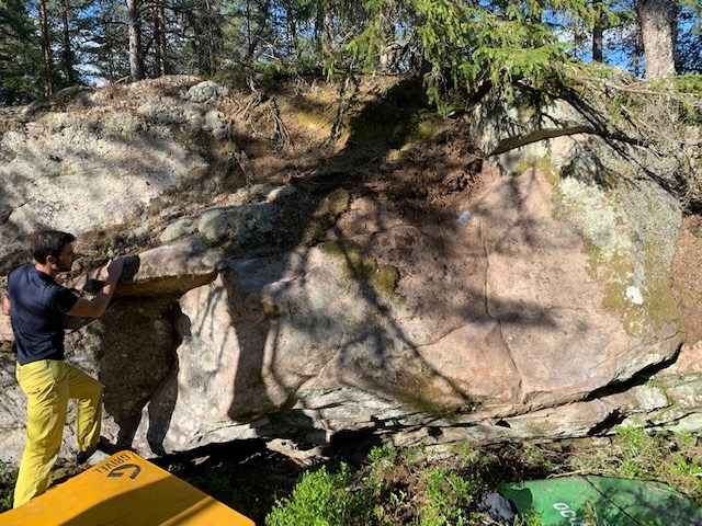Ståstart med start på fina grepp, leta dig ut klockan 11 över/genom "taket". Första etablerade problemet på Lerinklippan. FA Michael Soare 2019