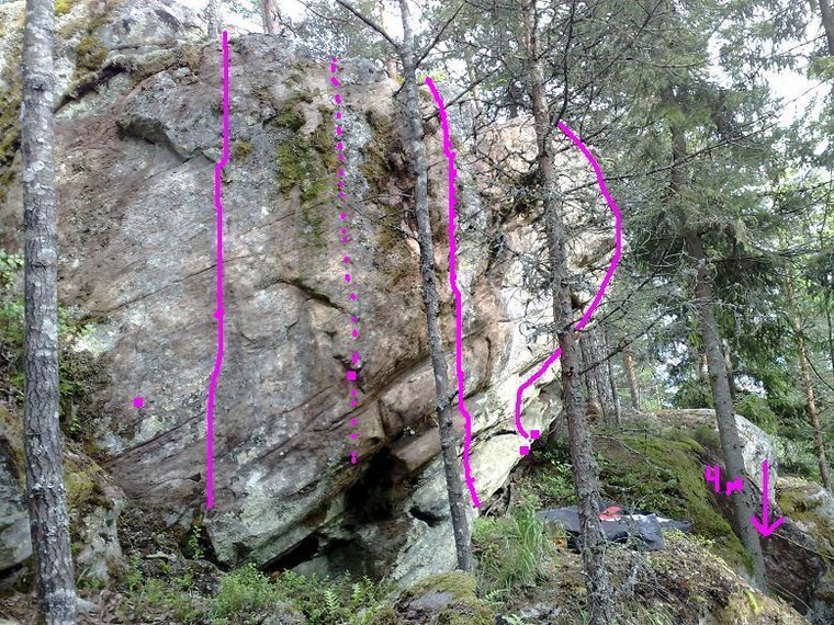 Fina grepp till flaket, därifrån sträckning till kant och urtoppning. Det lätta kruxet är i slutet, men där vill/får man å andra sidan inte falla. FA Sören Danielsson 2009
