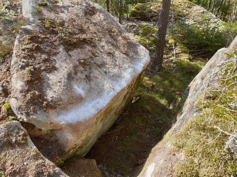 Börjar på kanten av stora stenblocket där "Dvärgflykten" går upp och toppar ut. Skapligt bra grepp på slopig kant, använd häl och tå och mantla sedan upp. Möjligen lite soft men repetitioner får avgöra.