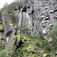 Noe løst. Mange sprekker med potensiell klatring. Rappell ned fra trær eller gå rundt og ned.