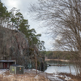 Very peaceful but somewhat strange located crag with several routes that starts from a "concrete balcony" above a rock room. The wall is primarily vertical and about 15 meters high. The routes starting from the "balcony" are around 11 meters. Despite the odd look, there are a couple of fun and technical face climbs here, and at least one visit is recommended. The parking is right next to the wall and you can literally belay from the trunk if you like - perfect for a couple of three hours of evening climbing after work. It's also cool in summer as the wall is facing east. Some of the routes were renovated -06, but unfortunately not all.