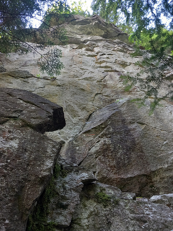 Hard technical crux with a long move in the middle of the route, then easier with a funny final overhang.
