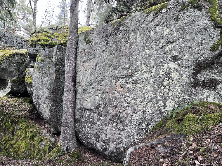 Ligger vid skogsklippan. Startar på två krimpar mitt på väggen. Dyno