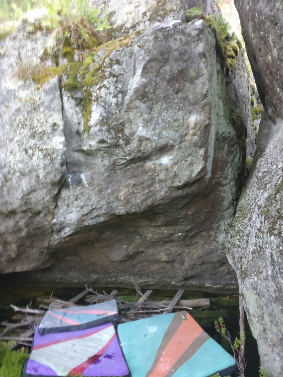 Vid vattenväggarna. Taket längst till vänster. Start med vänsterhand längst ner i sprickan och högerhand på limmad krimp.