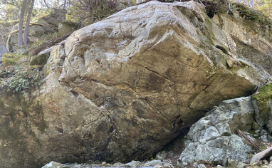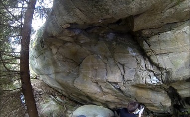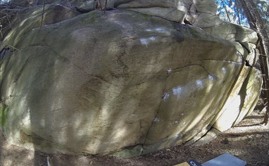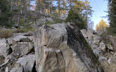 To get to the sectors Agdeåsen south and Bølgeveggen one goes through the cemetery and onto the path in the forest on the opposite side (NB: show consideration and do not step on graves!). To get to Bølgeveggen, take off the path after about 150m and go down the small slope from the saddle point on the small hill to the left. After that, follow the bottom of the small hill about 50m south until you reach the wall on your right. To get to Agdeåsen syd, take the trail after about 75m and go up the hill below the power line. Follow the top of the hill to the south until you reach a camp site (with a great view). Then continue down the ridge to the sector at the bottom of the ridge.