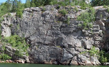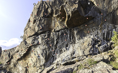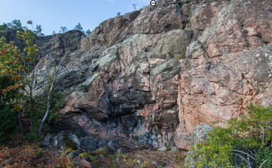 Drive Värmdöleden (222) towards Gustavsberg. Turn off towards Ingarö (646). After 2 km you pass a bridge, turn right immediately after the bridge and follow Lillängsdalsvägen for about 4 km. Park at the intersection Lillängdalsvägen / Dundervägen next to an electric house. Please note that there is only room for 3 cars here. If it is full, you MUST go back 4 km and park at the parking lot at Bergviksvägen. Then follow Dundervägen to its end. The path that takes at divides immediately, take left. The path immediately divides again, take left again. After about 100 meters follow the path to the right (from here there are green dots leading all the way down to Sjöklippan). After 200 m the path divides, turn left. After 50 m you start to approach the water and the rocks. Continue another 30-50 m along the path. Turn to left towards the water via a sloping slope and "open street" in the terrain (there is usually a small cairn (röse) to the right of the path that indicates where to turn towards the water). If you depart too early from the path, you will end up among cabins by the water. it's absolutely forbidden to go this way or along the coast to the crag. If you go wrong, back away, it has turned out that there are very aggressive homeowners here. Through different "floors", you will reach down to the water. At one passage keep right near the wall to avoid sliding down into the loose gravel, at another passage you hold a narrow tree and make an easier down climb (2 meters). The cliff is 50 m to the right when you have reached all the way down to the water.