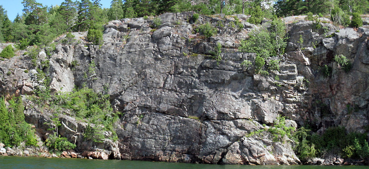 Korpen flyger (in bakom tallen) 6a, ca 13 m: Följ den tydliga sprickan i diedern upp bakom tallen. Ta det mycket försiktigt då vissa delar kan vara lösa. Ankra på järnöglan (förtöjningen) och busken/trädet ovanför.