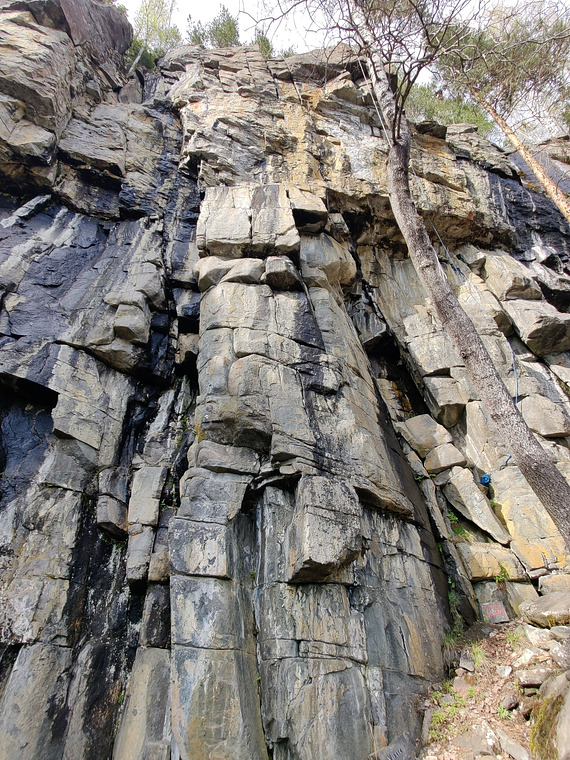Första bultade leden på klippan. Teknisk, pumpig med fint avslut. 9 bult