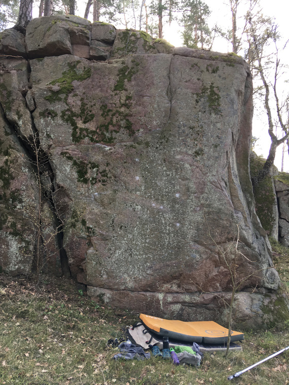 Should probably have a route grade instead. It would be E5 on gritstone!. Start on the left side of the slab. Tricky move to the crimp rail (not allowed to use the wide crack). Traverse the crimp rail and then the vertical seam. Highball!