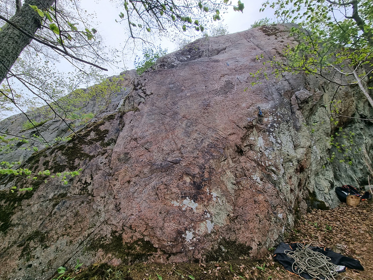 A quite technical slab on small crimps with a distinct crux. Shares anchor with Skicka mer pansarskott and Afasi.
