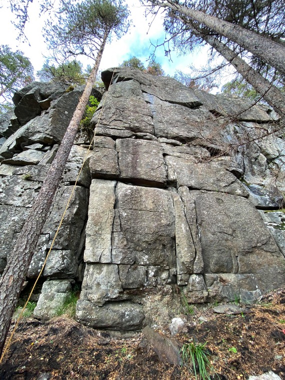 Wall above "Jag ser ljuset Jonathan", enabling you to climb from the bottom to the top instead of walking around. Easy to reach from above as well, plan is to mark a path down to the abseil - at the moment there are piled rocks leading to the rope-anchor around a tree. Well protected, a lot more climbing then it looks. 12-15 m?