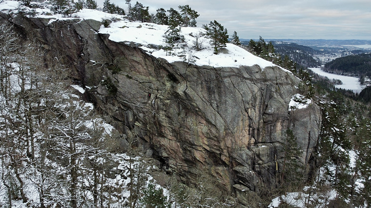 TL 1: 7+, naturlig sikret til naturlig standplass. TL 2: 6+. 2 bolter leder ut høyre. Derfra naturlig sikret rissklatring til topp. Standplass i tre på toppen.