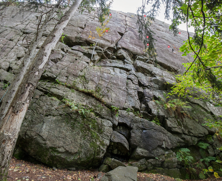 Fin klättring som ibland kräver att man går på för att hitta rätt position att säkra ifrån. Säkringar finns dock och klättringen är fin!