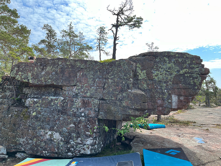 Start corner jug, travers to right, top out feet on ledge. TOP edge eliminated
