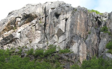Overhanging granite with lots of jugs! The approach is pretty steep, even a bit scary in some places.