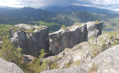3) Walking from parking: Walk along the car road, and walk PAST the first trail to Gygrestolen. Walk 350 meters further, and you will see a new trail (with sign) to Gygrestolen to the left. Take this trail for about 20 minutes, and look for a trail going left, that is marked by a small rock pile (this is the trail AFTER the trail leading to "Maurknatten"). Follow the small rock piles through rugged terrain until you reach the base of the corner of the west- and north face of Gamla.