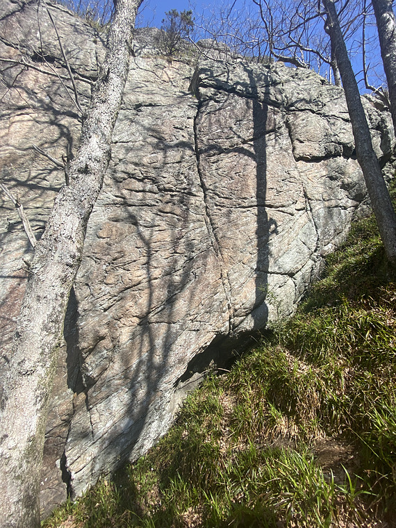 Short and bouldery, ends with one long move 10 bolts