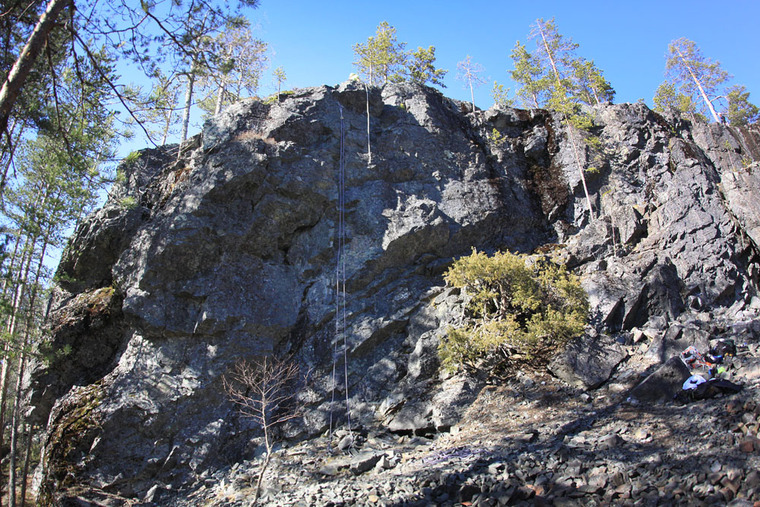 Six bolts and chain anchor. Some holds may be somewhat fragile, so climb carefully.