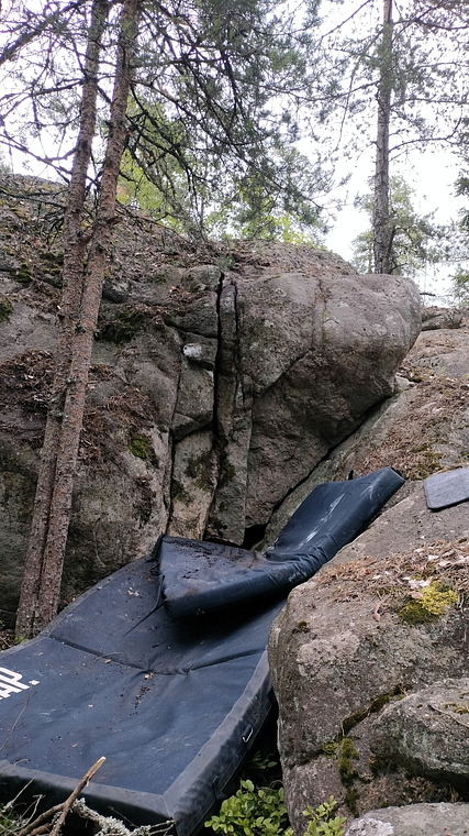 Sit start. Obvious right side slab eliminated. Top out towards the right side, onto the face. Route gets it's name from the otherworldly sound made by the first ascender during the top out.