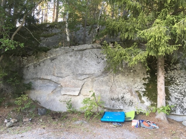Sit start at the begining of the crack, traverse to the right and top out as "Kalle"