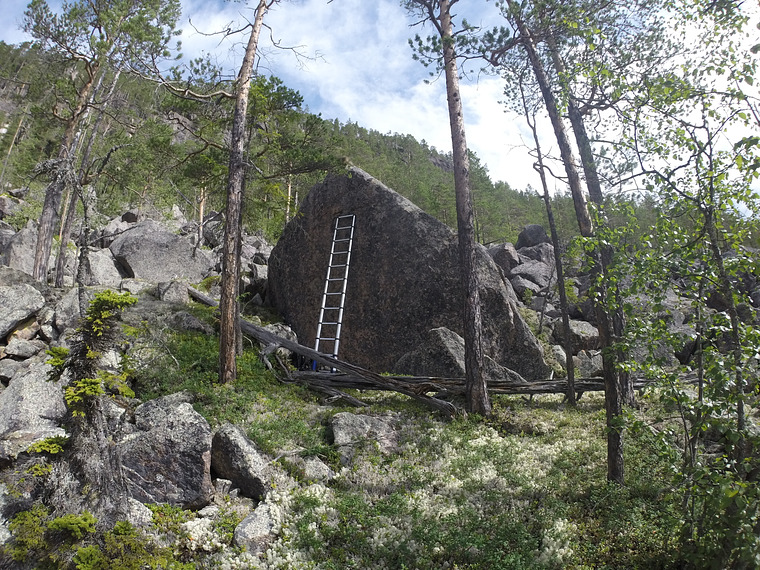 Sitstart with hands on small rock. Climb straight up to the arete and follow it to the highest point.