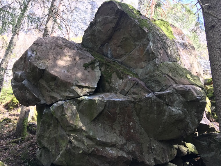 Sittstart, avslutter med uttopping på hylla. Lar den stå som selvstendig linje da denne ble gått først, selv om det i ettertid er gått ruter til topps. Passer for de som verken vil starte under den store steinen, eller avslutte til topps 😊
