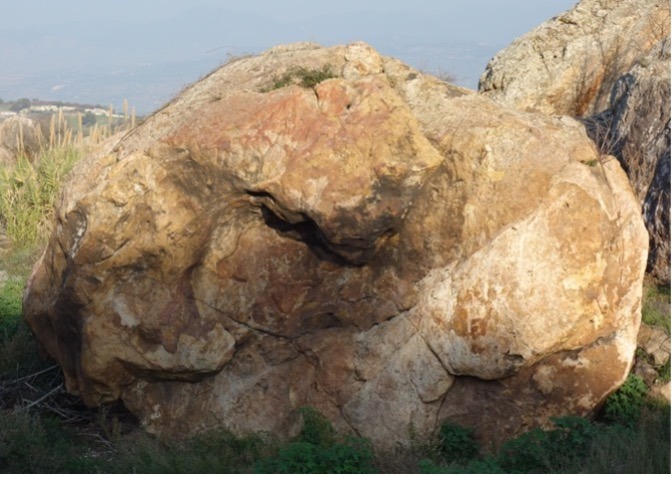 Go up and right around the overlap via the good holds on the flake to gain the top.