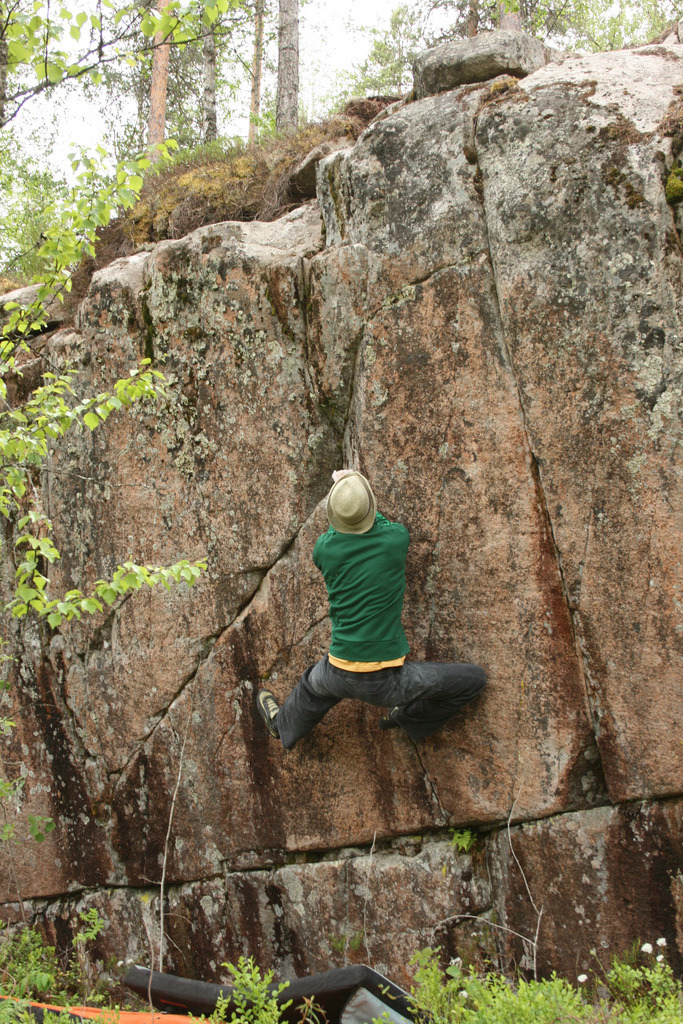 Juonionlahti is a Bouldering spot located on road 23 from Varkaus to Joensuu. The stones and faces are partly visible from the road on both sides. There are boulders ranging from easy to moderate. Some open projects also. The rock quality is generally good and compact. The stones tend to dry quite well but the faces can take some time to dry after rain. The approaches range from easy and short to a little bit more tenuous for the walls higher up on the hill. Some good choices for warmups are the small stone and the right side of the overhanging wall.