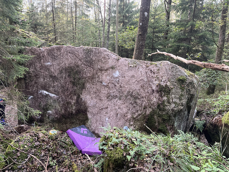 Sittstart vid areten på stenen, högerhand på bra grepp på högersidan av areten, vänster hand på mindre sidepull