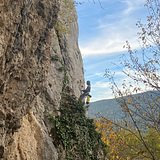 The rock is limestone, offering solid friction