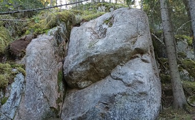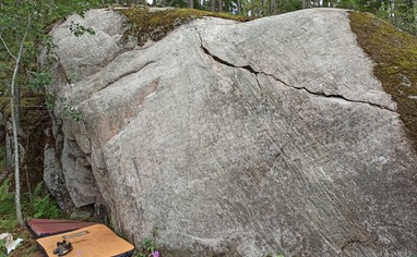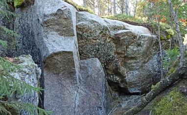 The road to sector Louhikko goes through a functioning quarry. The gravel road goes up from the left side of the quarry. The hike to the boulder is short but wet and there is some thick vegetation. Watch out where you step in the surroundings of the boulder as there is deep holes between rocks.