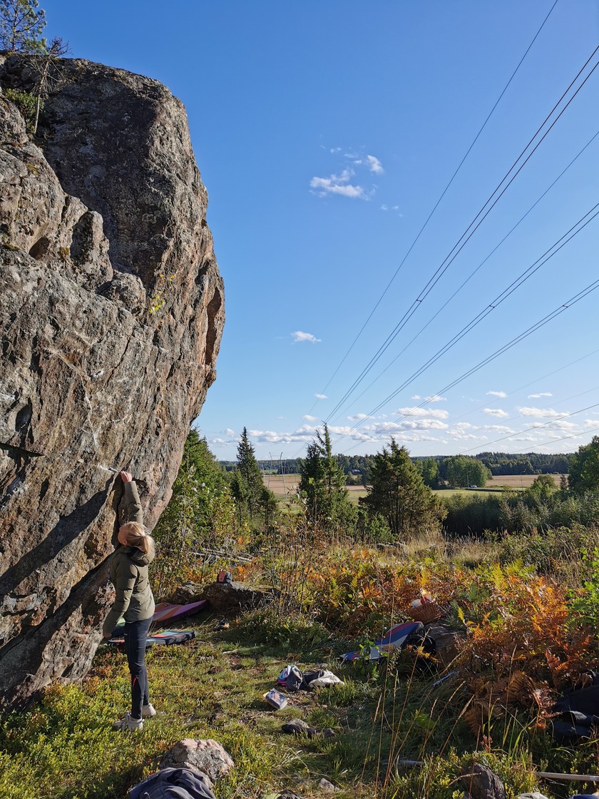 If you fancy a bouldering spot with a lot of easy routes, tall routes and a place with a view which dries fast, then Kellomäki is for you. Kellomäki big block has the size of a big house where the lowest parts are around 3 to 4 meters high and highest part is 7 to 8 meters high. Kellomäki big block was discovered in the early 2000 and it is located between Hyvinkää and Nurmijärvi. The block can also be seen from the road 45 also known as hämeentie while driving from Helsinki to Hyvinkää. There are only parking space for two cars next to the path that takes you directly to the big block but there are additional parking space next to Ridasjärventie.