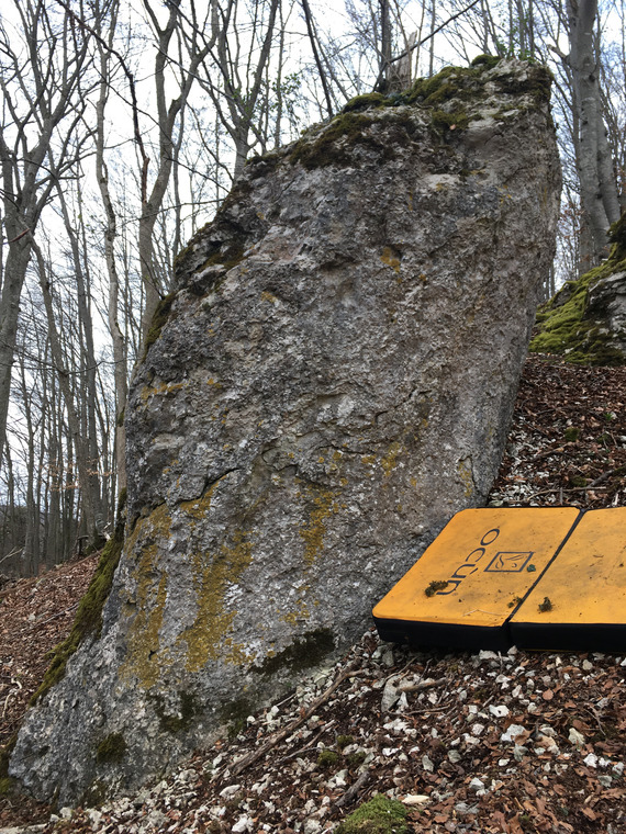 Sitzstart. Sehr gute Startgriffe, danach hoch an die sloperartige Kante, rechts in einen kleinen Riss, Kante umgreifen (härtester Zug), dynamisch an eine scharfe Leiste, links Hook und hoch zum bröseligen Ausstieg.